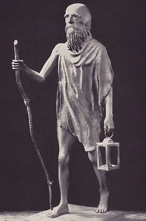 Said to be Clarence Shaler's personal favorite, Diogenes represents the sculptor's commitment to honesty--his favorite virtue. Diogenes was a greek mystic who rejected the ownership of material things. Living in a hall of records, he discarded his drinking cup when he saw a child use his hands. Diogenes wandered the city streets with a stick and a lamp "in search of an honest man." Shaler valued honesty above all else, and created Diogenes with honesty in mind. This 22-inch tall hermit was perched in the sculptor's fireplace mantle at his home in Pasadena, California.